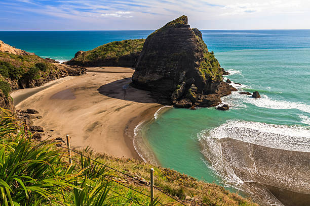 Piha Beach is New Zealand's most famous surf destination, known for its dramatic volcanic black sand and rugged scenery.